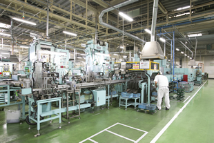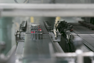 当社の焼結製造ラインでは、プレス成形、焼結、サイジング(矯正)、2次加工までを無人化しており、抽出検査、設備の稼働チェックのみ技術者が行う小人数体制での量産を可能しています。